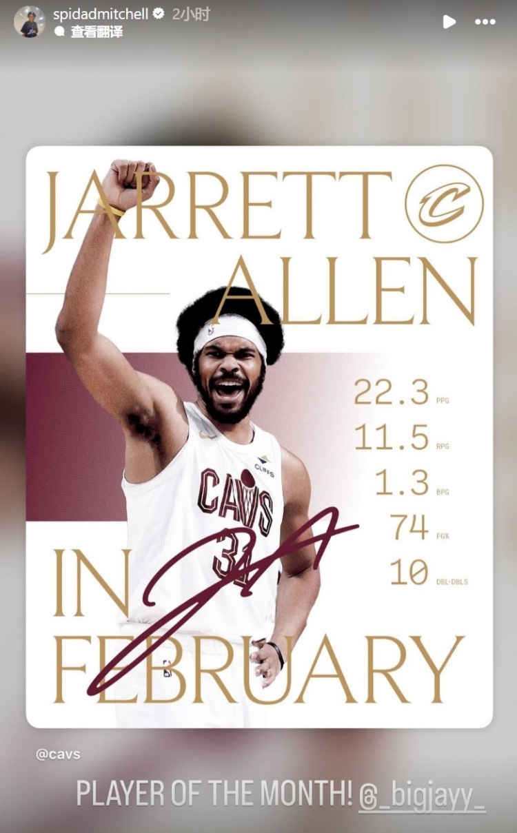 3月1日讯 今天,骑士官方晒出了贾勒特·阿伦二月份的数据,场均能得到22.3分11.5篮板1.3盖帽,投篮命中率74%,得到10次两双。队友米切尔转发评论道:“月最佳球员。”...